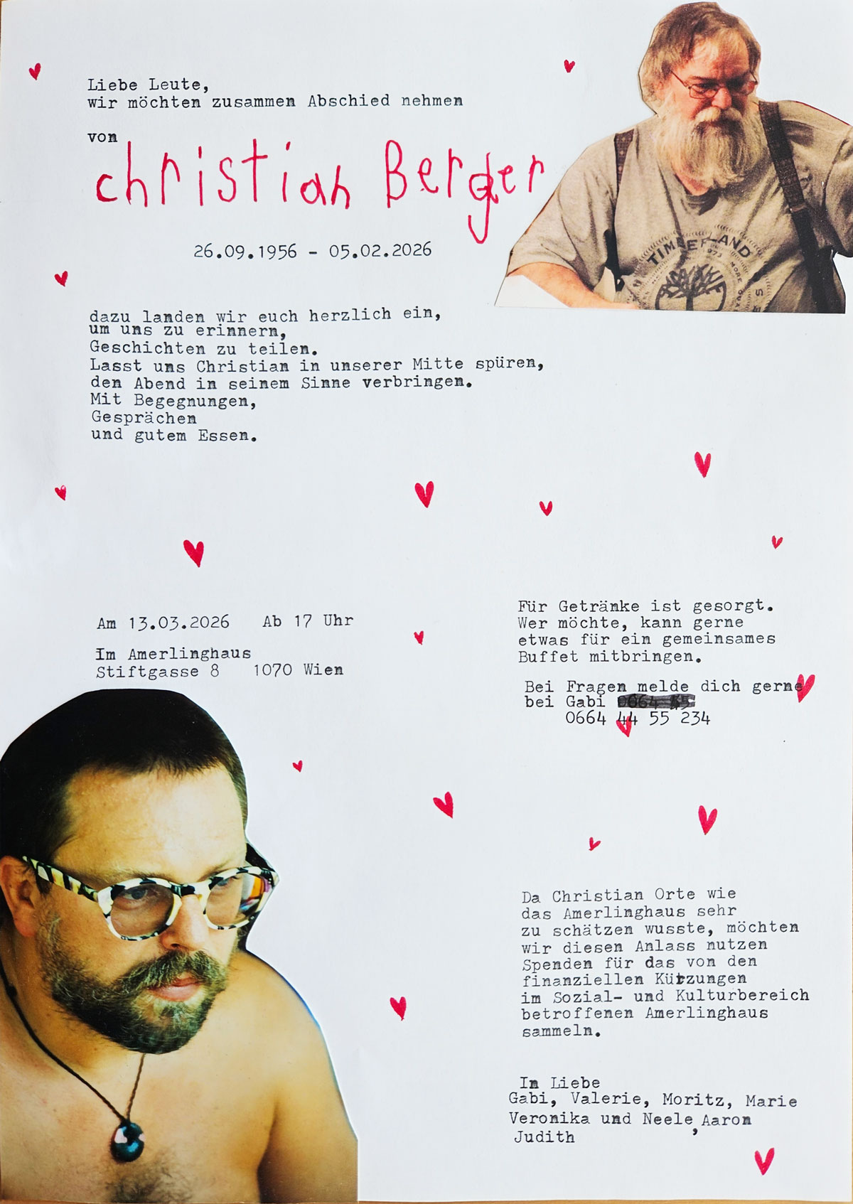 Veröffentlicht am 2. März 20262. März 2026 von Regina Leibetseder-LöwVerabschiedung von Christian Zusammen Abschied nehmen von Christian Berger am 13. 3. 2026 ab 17 Uhr im Amerlinghaus Stiftgasse 8, 1070 Wien Für Getränke ist gesorgt, wer möchte, kann gerne etwas für ein gemeinsames Buffet mitbringen.